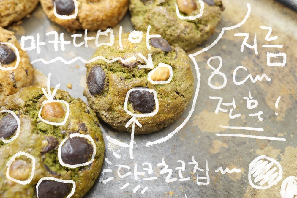 마카다미아를 초코칩과 경쟁하며 눌러 박았습니다.