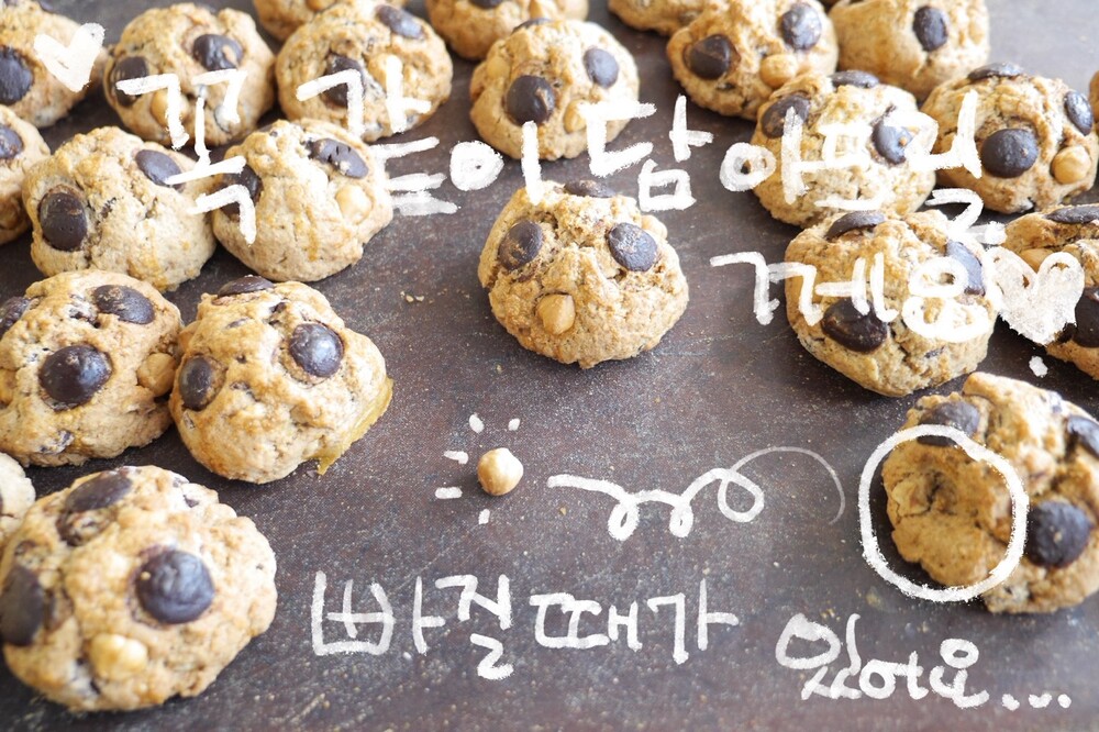 둥그런 통밀 반죽에 초코칩과 자리를 다투어 꾸며봅니다.