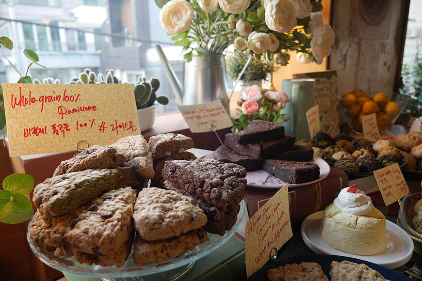 비정제 통곡물 100%를 바탕으로 무삼백(NO 백밀가루, NO 흰쌀가루, NO 정제설탕) 슬로건을 걸고 여러 종류의 스콘과 쿠키, 글루텐 프리 케이크를 선보이며 건강한 디저트를 찾는 사람들에게 많은 호응을 받고 있습니다.